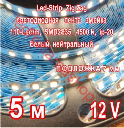 Zig Zag светодиодная лента ЗМЕЙКА, 12 V, 6.48 W/м, 110-LED/м, подложка 7 мм, БЕЛЫЙ НЕЙТРАЛЬНЫЙ, 4500 k, 5 м